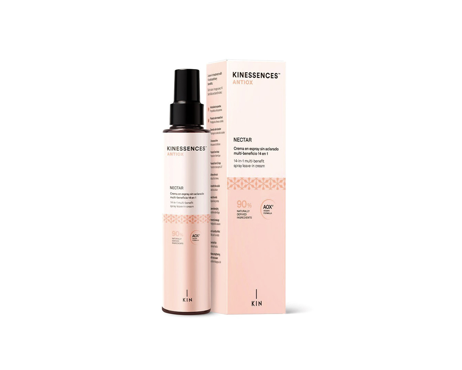 El Kinessences Nectar Antiox 150 ml de KIN Cosmetics es un tratamiento en crema-spray sin aclarado que ofrece 14 beneficios en un solo gesto. Su fórmula innovadora, basada en la tecnología AOX y un cóctel de 5 frutas antioxidantes (dátil, goji, grosellero negro, guayaba y quadong), protege y revitaliza el cabello desde la raíz hasta las puntas.